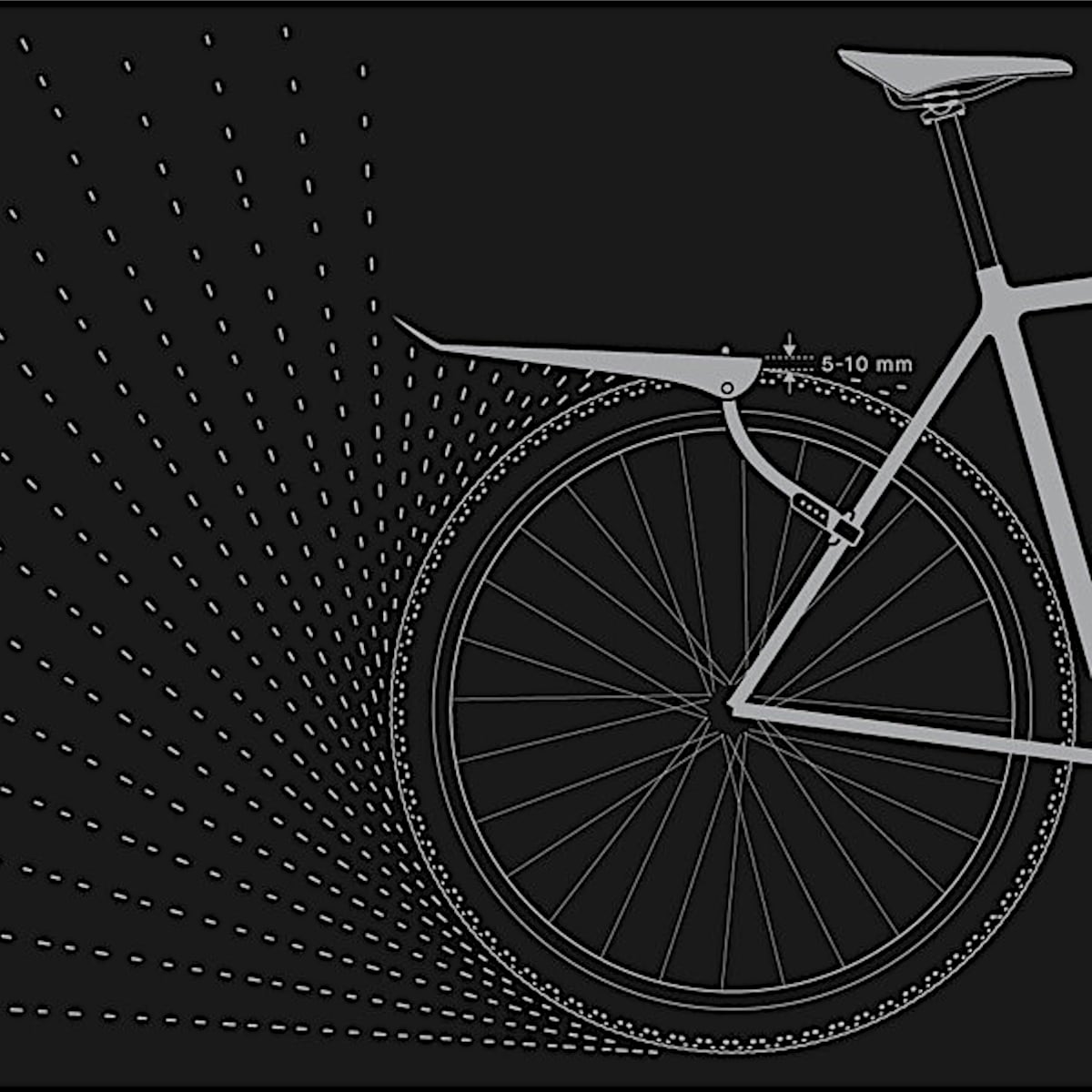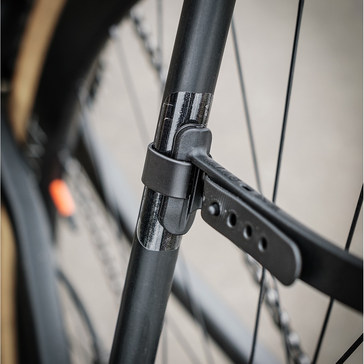 Le Win Wing couvre des pneus jusqu’à env. 35 mm des vélos de course comme des vélos de route sans garde-boue avec des pneus étroits. La couverture de roue arrière est constituée de quatre pièces seulement: Le support suspendu, qui est attaché aux haubans par deux sangles en caoutchouc, et le garde-boue à clipser. Celui-ci peut être orienté à ses trois différents lieux de montage. Pour profiter de la meilleure protection possible, le pare-boue est monté en haut aussi proche que possible de la roue arrière. Malgré la flexibilité, la conception du garde-boue ne claque ni ne se coince sur le pavé ou si les feuilles s’accrochent au profil de votre pneu. Avant nettoyage, on déclipse la protection anti-éclaboussures rapidement et la débarrasse de la saleté.