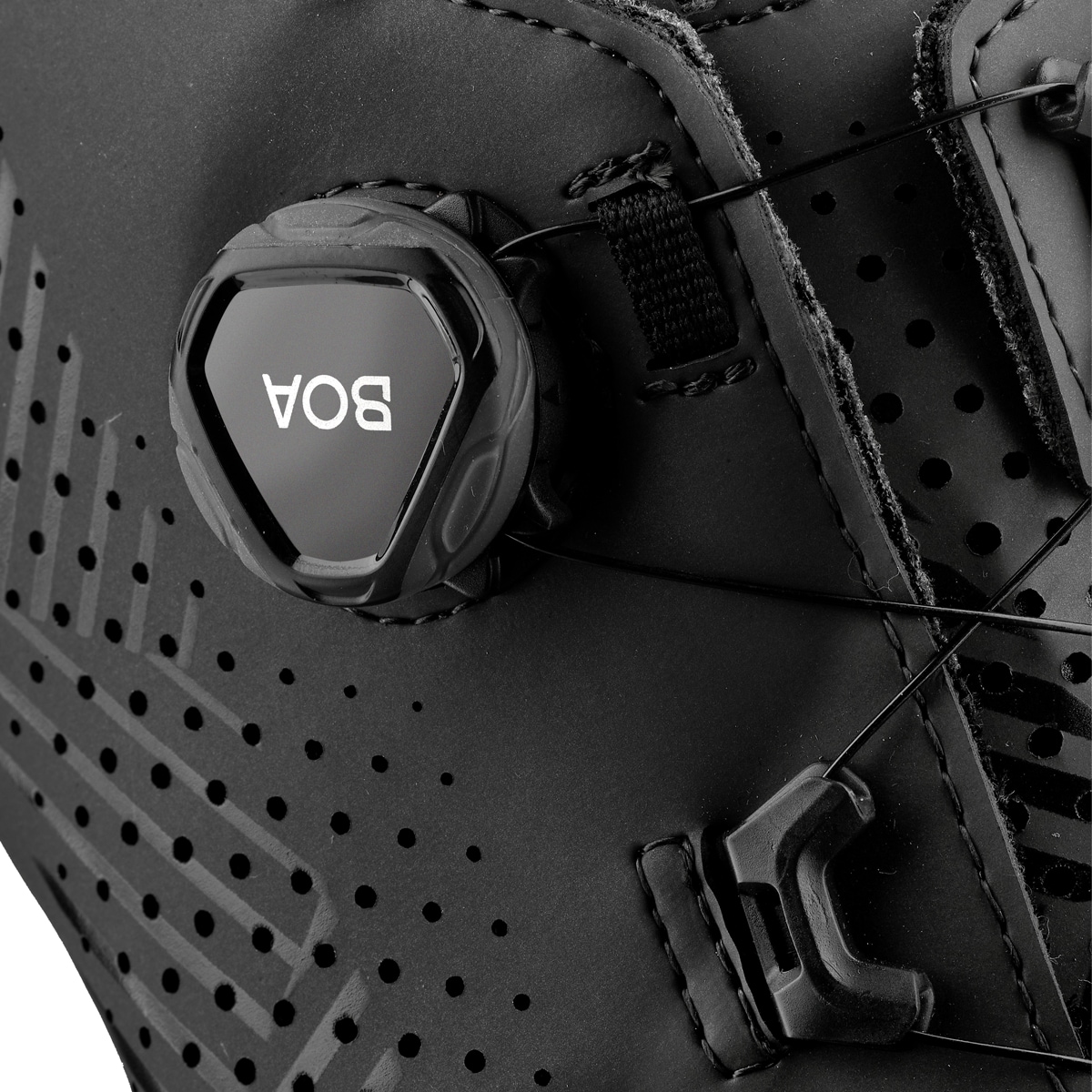 Le système de fermeture est constitué de molettes et de câbles en acier inoxydable qui permettent tous ensemble un ajustage très précis. Il est placé de manière à permettre au cycliste de faire des ajustages en route. Vu l’absence de velcros, l’air peut très bien circuler à l’avant du pied. En appuyant sur la molette et en la tournant dans le sens de la marche, vous fermez la chaussure. En tirant la molette, vous pouvez desserrer les lacets.