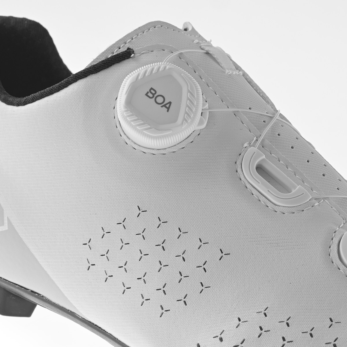 Le système BOA Fit L6 est constitué de trois parties essentielles: d'une molette de fermeture de réglage précis, des cordes légères mais pourtant extrêmement résistantes et des guides de corde anti-frictions. La combinaison de ces éléments améliore l'ajustement et évite des contusions. Vu l’absence de velcros, l’air peut mieux circuler à l’avant du pied.
