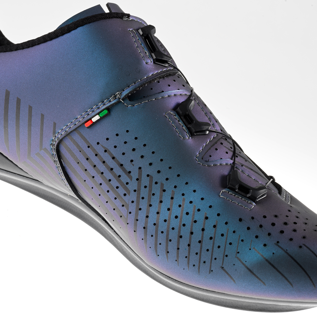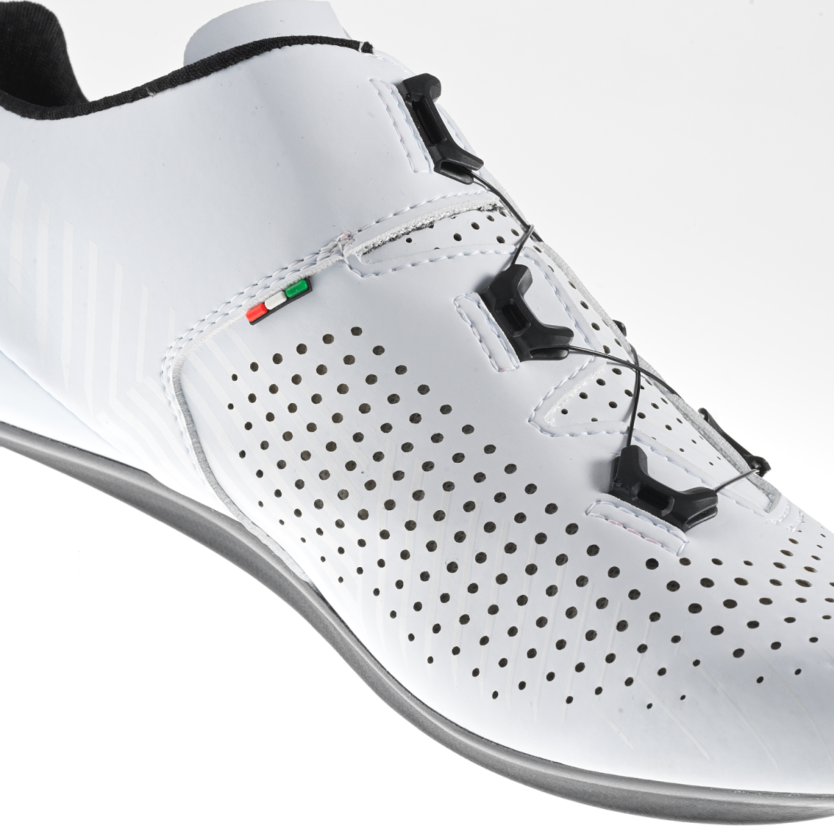 Le système de fermeture est constitué de molettes et de câbles en acier inoxydable qui permettent tous ensemble un ajustage très précis. Il est placé de manière à permettre au cycliste de faire des ajustages en route. Vu l’absence de velcros, l’air peut très bien circuler à l’avant du pied. En appuyant sur la molette et en la tournant dans le sens de la marche, vous fermez la chaussure. En tirant la molette, vous pouvez desserrer les lacets.