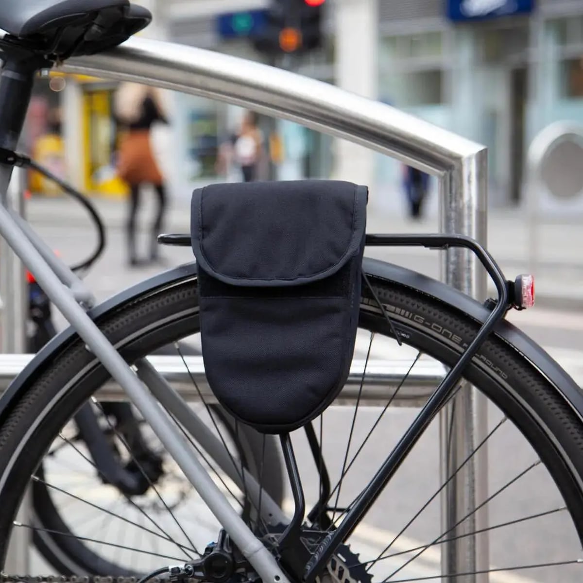 Il y a à l’arrière des bandes velcro pour attacher le sac variablement au porte-bagages, au cadre du vélo ou au cintre. Mais vous pouvez également faire passer une ceinture de pantalon par les boucles de fixation du Carry Pouch et porter le sac directement sur vous, ayant l’antivol de vélo toujours rapidement à portée de main.