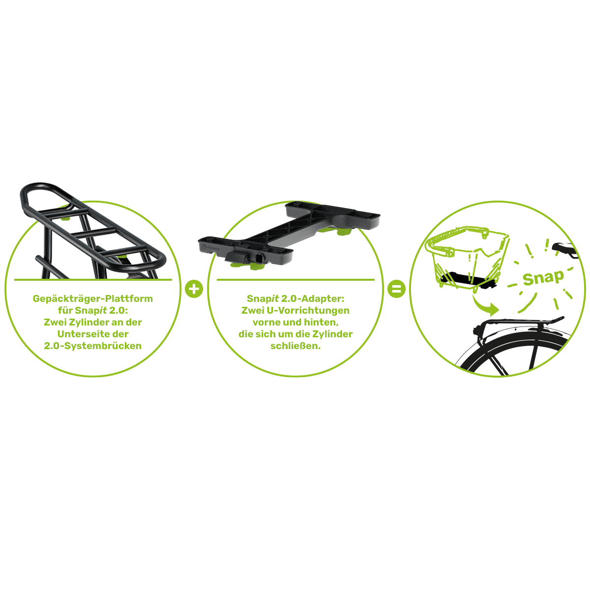 Si votre vélo n'est pas équipé du porte-bagages RACKTIME compatible avec le système de fixation, vous pouvez monter sur tous les porte-bagages usuels en tubes ronds la plaque pour porte-bagages SNAPIT 2.0 CONNECT en tant qu'adaptateur intermédiaire (art. 234180501).