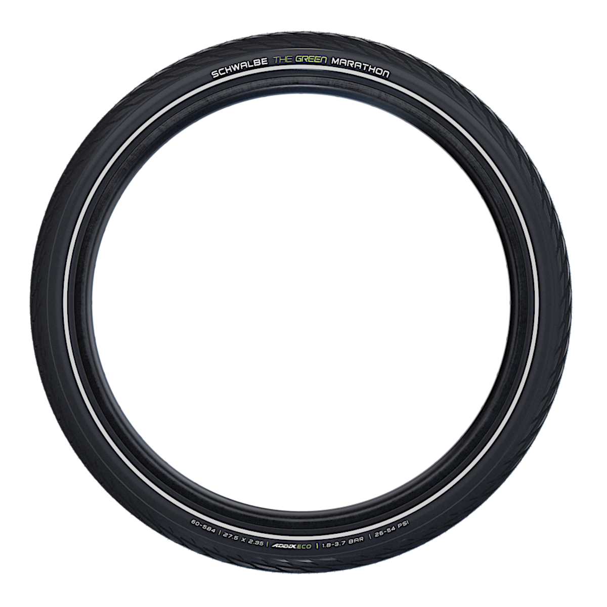 Le Schwalbe Green Marathon prouve que le recyclage et la qualité reconnue des pneus peuvent être conciliés. Étant pionnier en matière de protection anti-crevaison, de kilométrage et de respect de l'environnement, la version « verte » de ce pneu approuvé pour la ville et le cyclotourisme est dès à présent encore plus durable. La production avec du caoutchouc issu du commerce équitable, labellisé Fair Rubber, contribue à améliorer les conditions de travail et de vie des producteurs. Le pneu est presque entièrement exempt de substances nocives et à peu près trois-quarts en sont faits de matériaux recyclés et renouvelables. Pour la suie qui colore en noir, Schwalbe choisit des produits issus de pneus recyclés pour le vélo.