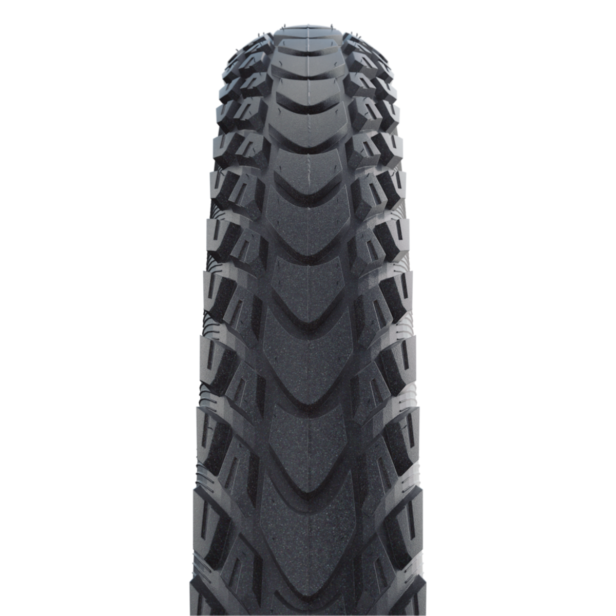 Conçu pour les routes, pistes et chemins du monde entier. Ce n'est pas sans raison que le profil est adopté du Marathon XR, mais est un peu plus plat, ce qui a un effet positif sur la résistance au roulement. Les technologies Schwalbe Evo actuelles telles que Travel Star Compound et Double Defense offrent légèreté et robustesse extrême.