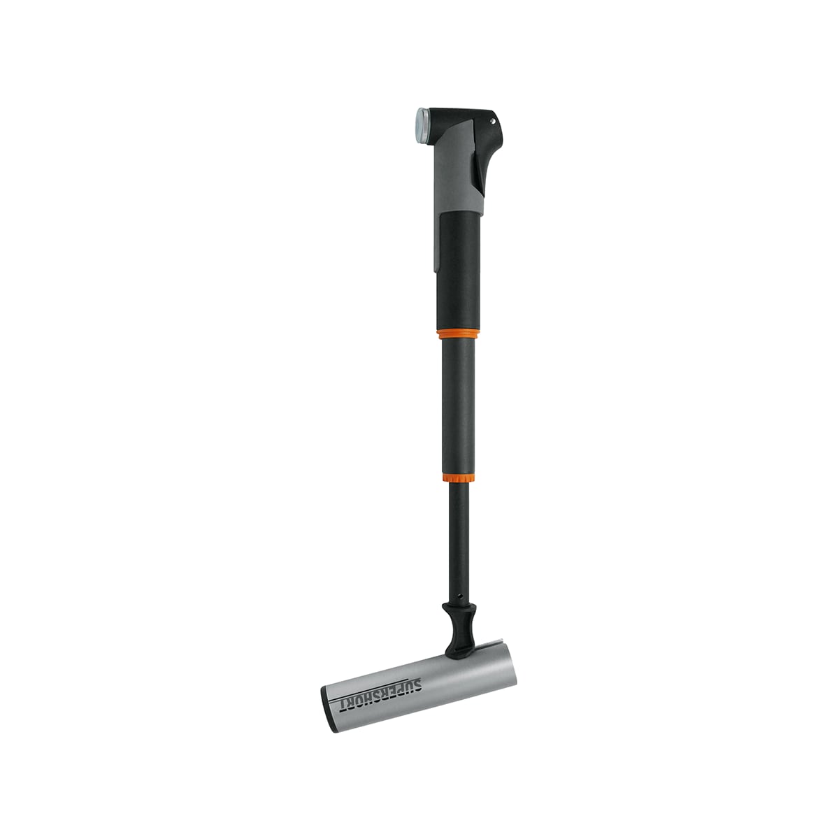 Petite, plus petite, Supershort! La mini pompe Supershort de SKS Germany mérite son nom à coup sûr! Elle ne fait que 164 mm de long et ne pèse qu’un peu plus de 100 grammes. Voilà l’accessoire parfait pour la poche du maillot. Autrement, on peut l’installer avec le support de cadre livré avec que l’on peut mettre en place même sous un porte-bidon. Super pratique, c’est aussi le tube en aluminium que l’on peut détacher et alors utiliser comme poignée en T pour un gonflage convivial. Il y a un levier de blocage qui tient la SKS Supershort sur tout type de valve.