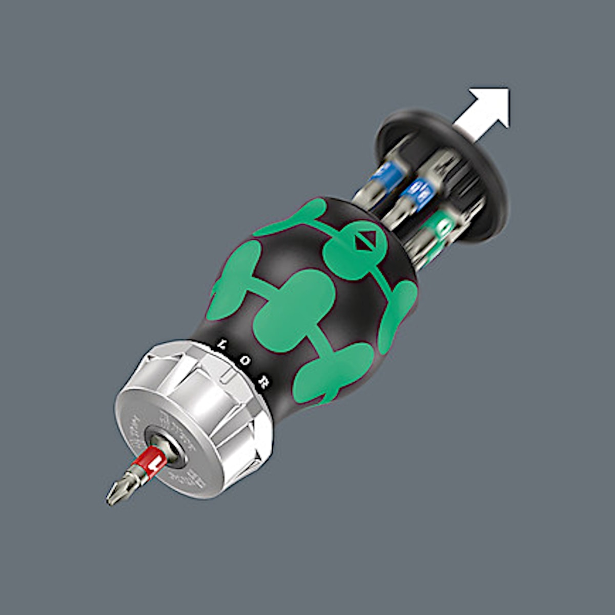 L’outil Tom Pouce avec fonction cliquet du Wera Bicycle Set 5 satisfait par tout son potentiel qu’il déploie aux visseries exigües difficiles d’accès. La forme compacte et les embouts d’outil courts vous fait profiter d’un angle avantageux pour un transfert parfait de la force afin de ne pas endommager les têtes des vis et visser en toute sécurité. La fonction cliquet et de verrouillage facilement réglable du manche en forme Tom Pouce et le crantage fin avec un petit angle de retour vous aident à effectuer un travail précis. L'aimant permanent puissant du porte-embout garantit que l'embout sélectionné est bien fixé. En plus de l'outil dans le porte-embouts, les 6 autres embouts en acier inoxydable du jeu d'outils peuvent être rangés clairement et en sécurité dans un réservoir situé dans le manche. Vous pouvez le sortir du bas de la poignée et le faire pivoter pour un meilleur accès.